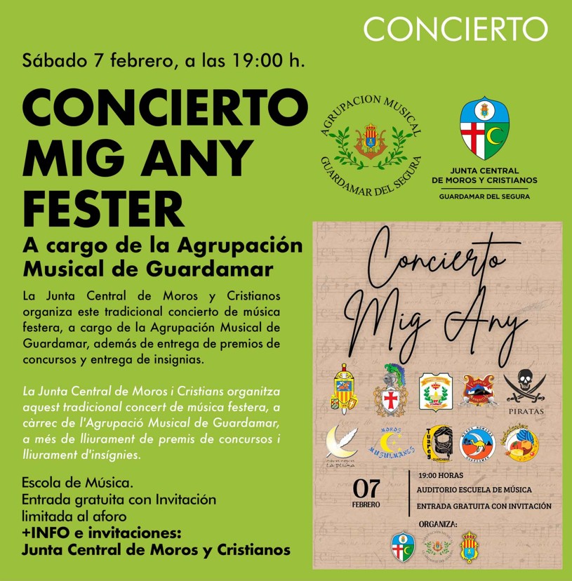 Guardamar del Segura, evento cultural: Concierto de música festera ‘Mig Any Fester’, entrega de premios de los concursos de fotografía y de escaparates y entrega de las insignias, dentro de la agenda municipal de febrero del Ayuntamiento